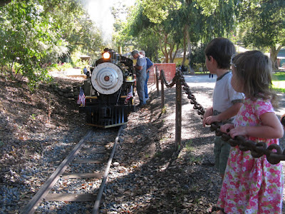 The best outting we took while Gina was away: Vasona Park in Los Gatos with our friends from San Francisco. We enjoyed a narrow-guage steam train ride around the park, carousel ride, ice treats and then shady picnic while the adults ate and kids climbed the trees. Afterwards we braved the heat to do a little park play on the fire engine, wooden train, play sculpture and jet plane. It was a great end of summer outing for the two new Kindergartners and their younger siblings. Do these kids know how nice they have it?